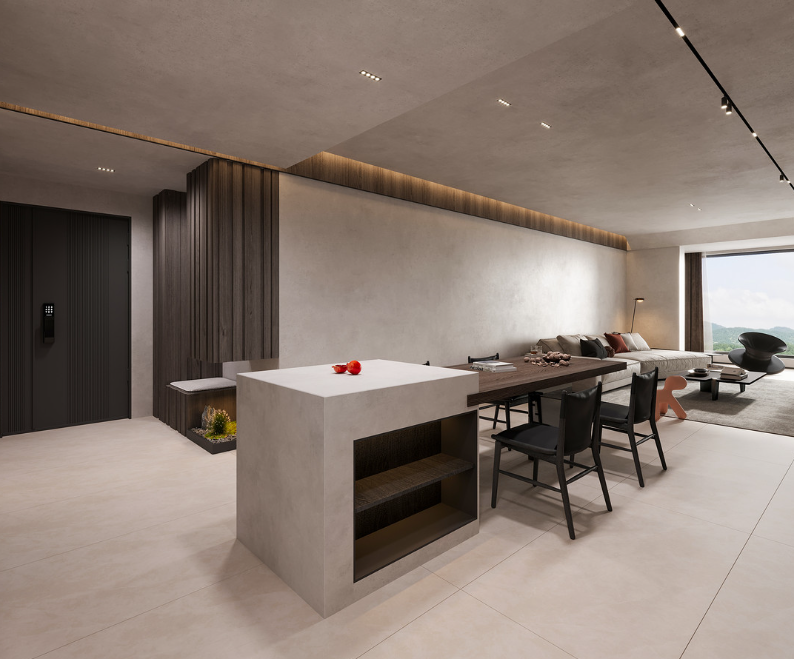 入户门厅玄关采用虚实结合的巧妙设计,运用竖条栅板材增添空间层次感与艺术感。灯光设计尤为关键,营造出柔和而富有层次感的光影效果,为归家时刻带来温馨舒适的氛围,同时展现出精致与品味。