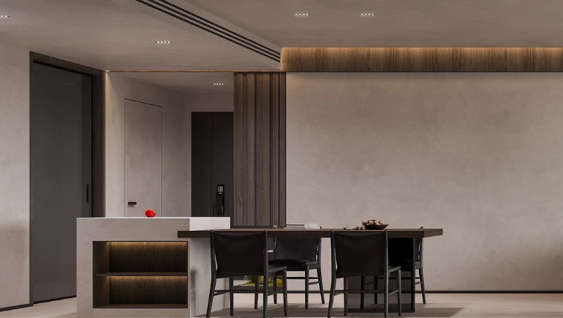 餐厅地砖选用皇家白柔光质感岩板,其细腻的质感与光泽度,不仅提升了空间的明亮度,还增添了一份高雅的气质。原木咖色长城板材的运用,为餐厅注入了自然与温馨的元素,使整个用餐空间更加宜人。