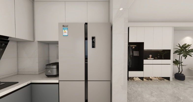 封闭式厨房选用半嵌入式冰箱,完美嵌入橱柜体系,装修案例最大程度增加厨房储物空间,提升空间利用率。