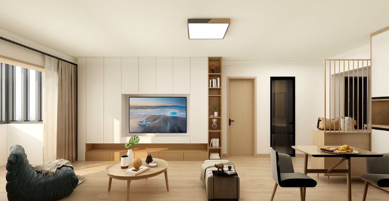 客厅摒弃冗余装饰,以微水泥墙面奠定基调,搭配原木色悬浮电视柜,形成 "素简基底 + 自然点缀" 的空间公式。大面积留白设计,让光线在亚麻色窗帘间自由流淌,演绎东方禅意美学。