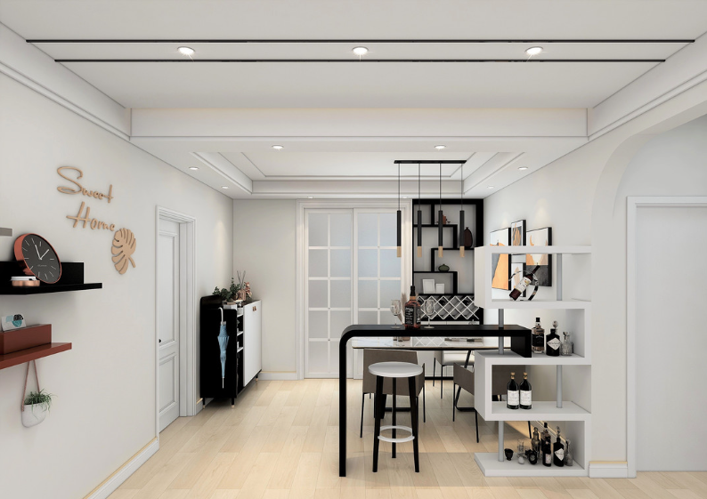 客厅与餐厅之间,一座时尚吧台轻盈悬浮,它既是划分空间的隐形魔法线,又似一位优雅的缓冲使者,巧妙隔开烟火气与休憩氛围。