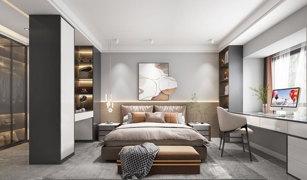 卧室里,玻璃材质与线性灯碰撞出独特设计感,原本的飘窗改造成办公区,抬眼便是窗外风景,采光好得让人惊喜。床头背景墙用木饰面搭配线条灯,省去了传统床头的臃肿,为空间腾出更多呼吸感,而吊灯的设计,则为夜晚的阅读时光添了一抹恰到好处的光亮,让休憩与工作在此和谐共存。