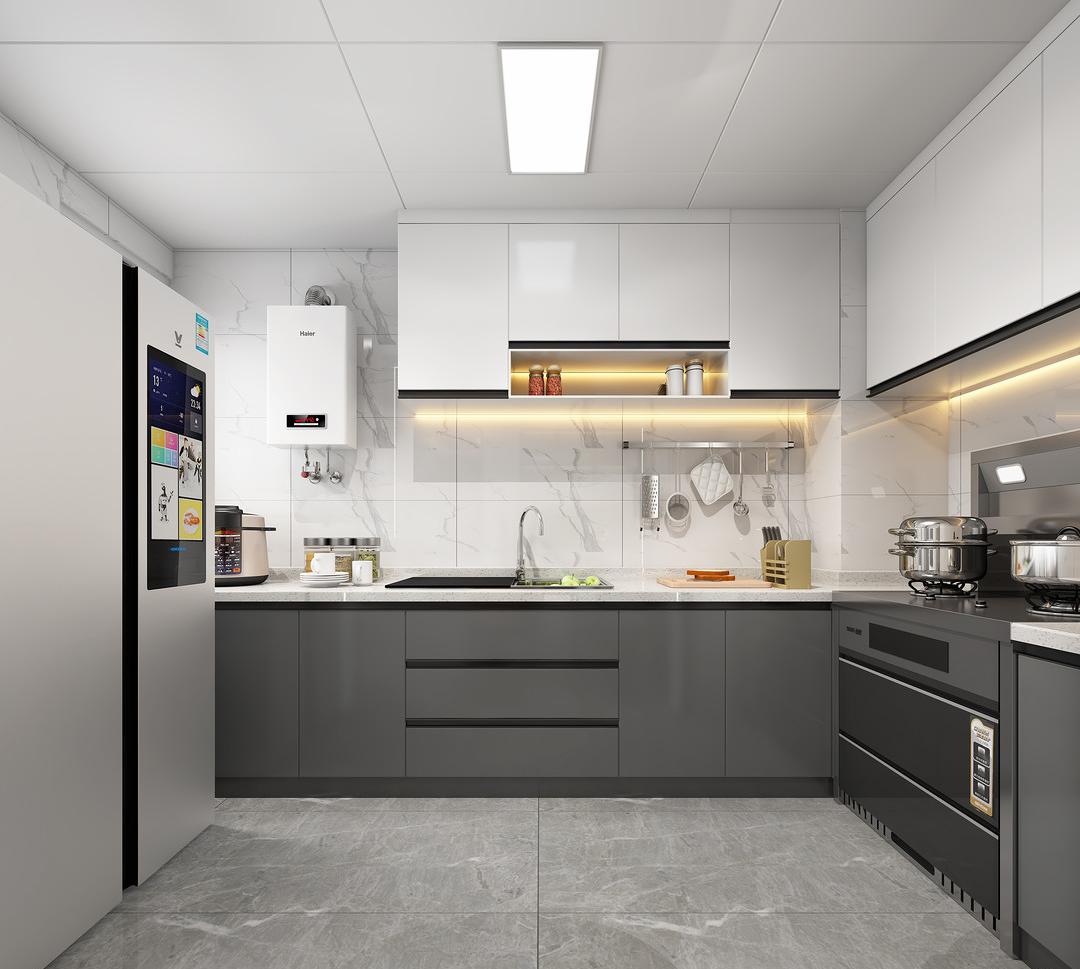 开放式厨房让空间感豁然开朗,冰箱藏于其中,悄悄缩短了操作动线,做饭时少了来回奔波的匆忙。洗碗机选择台上设计,省下的地柜空间成了储物小能手,与洗菜盆一体相连,操作起来顺手又便捷。集成灶蒸烤箱一体的设计更是巧妙,既省下了吊柜空间,又避免了蒸烤箱占用柜体的烦恼,白色大理石纹理墙砖铺开,从视觉上放大了厨房的开阔感,让烹饪也成了一种享受。