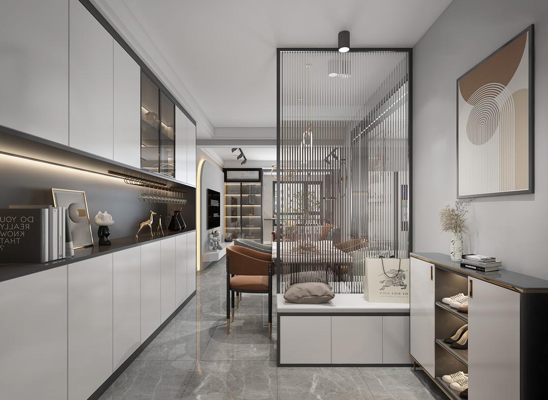 入户第一眼便见巧思:极窄边框的长虹玻璃如朦胧屏风,与落地换鞋凳默契相依。既让换鞋时能安稳落座,又巧妙化解了入户直对窗户的风水顾虑,在保障私密感的同时,更添几分精致巧韵。左侧餐边柜与展示柜相映成趣,灯带流转间,黑色玻璃更显格调,视觉上悄然拉宽了空间的纵深感,每一处都藏着对生活的细腻考量。