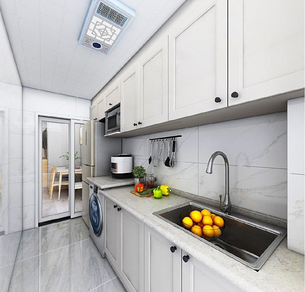 洗衣机迁居厨房,成了空间利用的妙笔,在烹饪烟火旁从容完成洗衣任务,功能需求尽数满足。墙面覆以釉面砖,光滑表面让清洁打理变得轻松写意,油污污渍一擦即净。