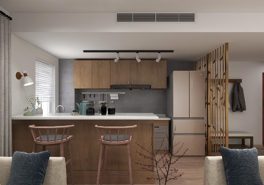 开放式厨房大胆拆掉了隔阂,定制柜体与木地板默契地穿上同色系,让烹饪区与生活场自然交融,每一次转身都能感受到空间的流畅与和谐。