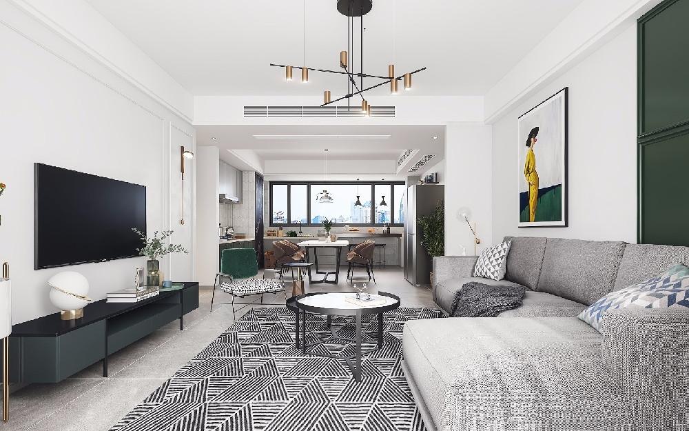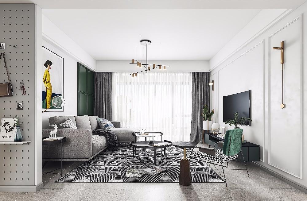 客厅的双眼皮吊顶如同温柔的弧度拥抱整个空间,电视背景墙两侧的壁灯洒下暖光,搭配精致线条勾勒,光影交错间尽显层次感,让日常休憩更添温馨氛围。