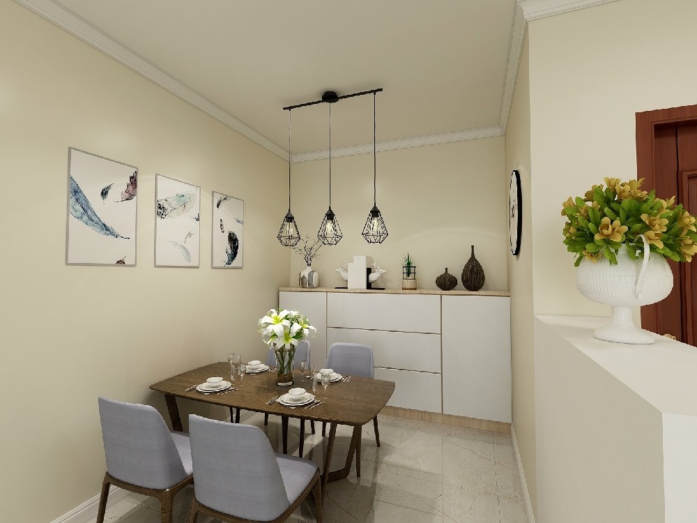 餐厅布局紧邻用餐区定制整面收纳柜体,不仅满足日常储物需求,更巧妙化解开门见厅的通透难题,为空间增添过渡感与私密性。