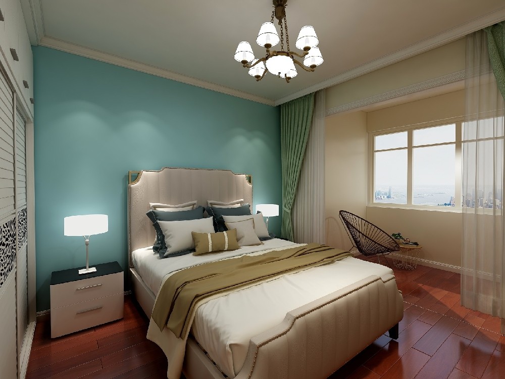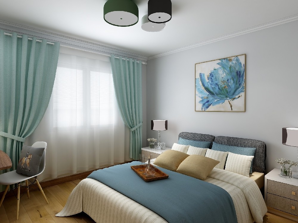 卧室延续睡眠空间延续客厅的设计脉络,同样以线条元素与乳胶漆墙面为基础,保持全屋风格的统一性,营造出连贯且舒适的居住氛围。