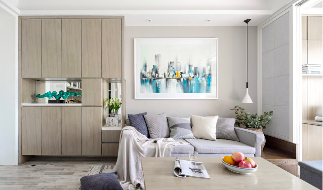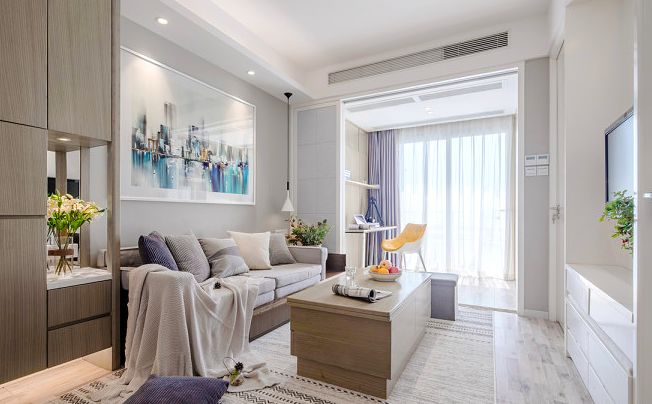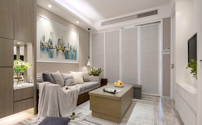 46㎡夫妻宅打破面积限制,将玄关、客厅与多功能房融成方正整体,让光线无遮挡涌入,通风对流更顺畅,视觉上瞬间扩容。