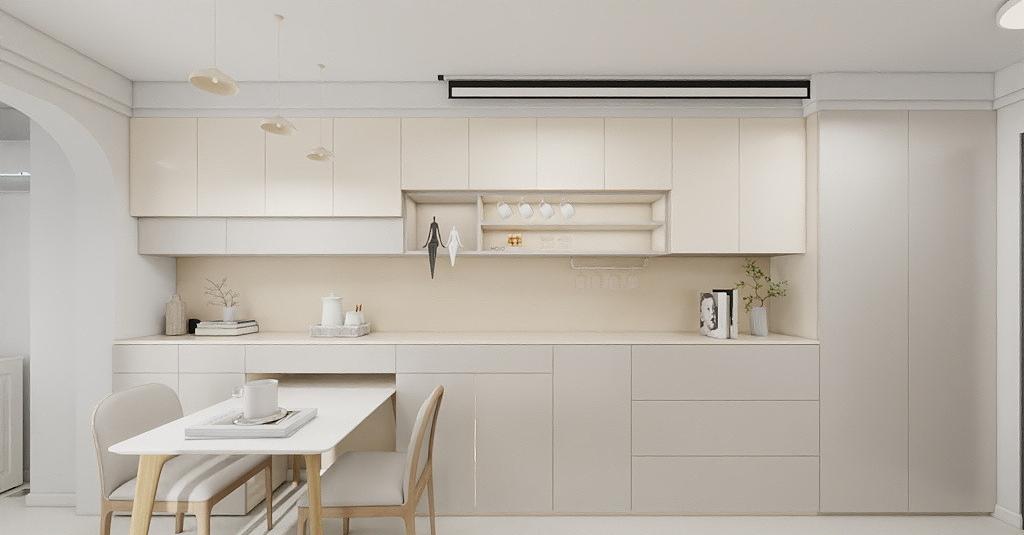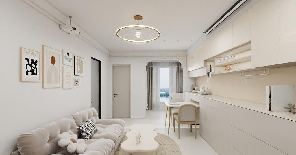 该一居室奶油风全包装修设计案例,客厅里,投影仪与幕布组成私享影院,周末窝在沙发上,光影流转间尽是松弛;一整排定制柜藏住琐碎,留白处摆上绿植与手作,让收纳也成为风景。圆弧门设计柔化了空间棱角,每一次开合都带着温柔的仪式感,双眼皮吊顶层次分明,勾勒出简约而不简单的顶部线条。卧室更是治愈的秘境,卧榻靠窗而设,晨起看朝阳漫过窗台,睡前伴星光翻几页书。在这里,每一处细节都藏着对生活的热爱,没有繁复的堆砌,只有恰到好处的舒适与精致,让奔波的心找到安稳的归处,让日常的每一刻都充满小确幸。