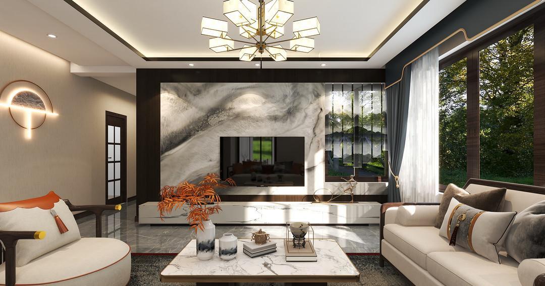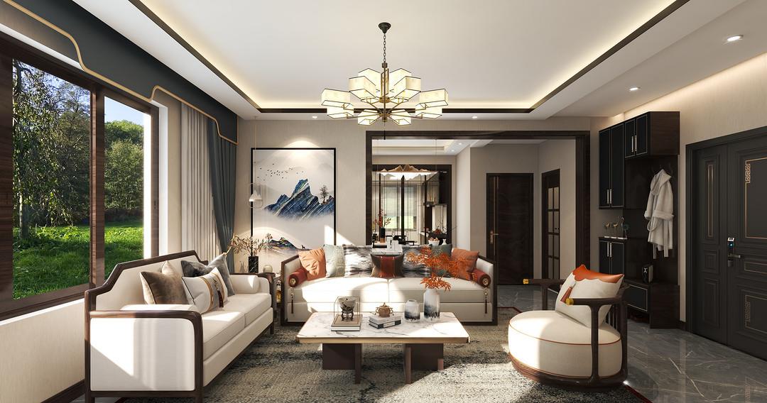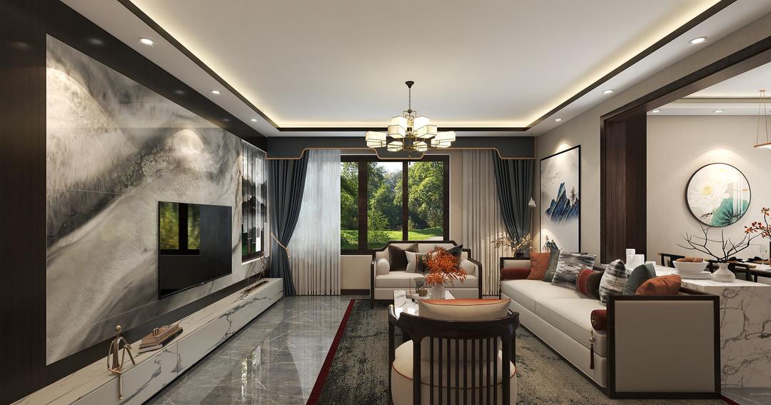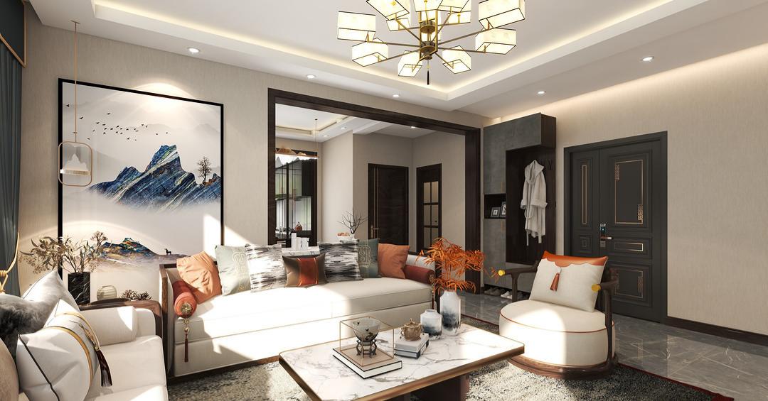 客厅的穹顶开阔大气,沙发的柔和色调中和了都市的喧嚣,金属装饰像星星一样点缀其间,打造出舒适又精致的生活空间。电视墙巧妙融合了收纳与装饰,满是生活的烟火气与雅致感。