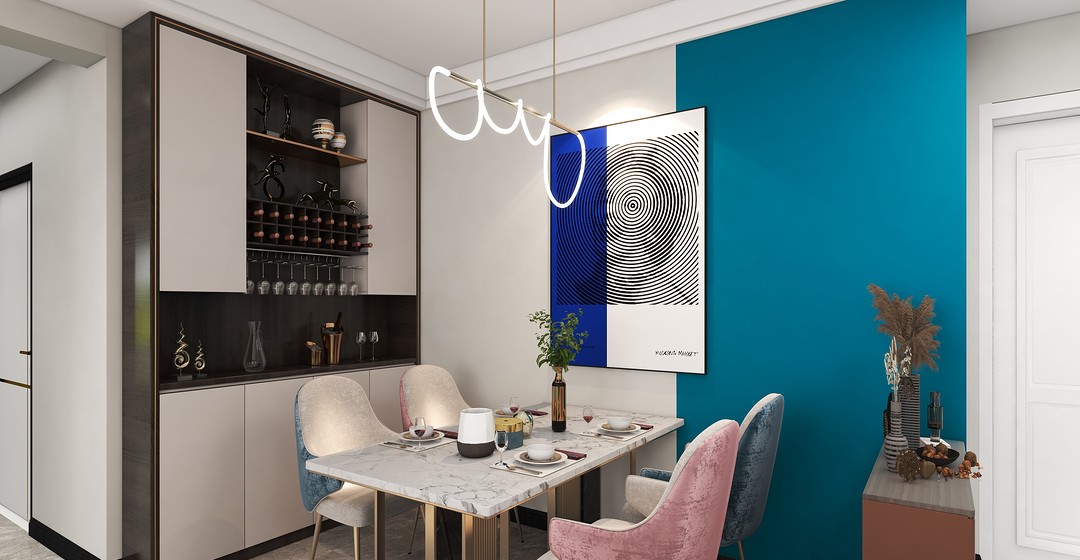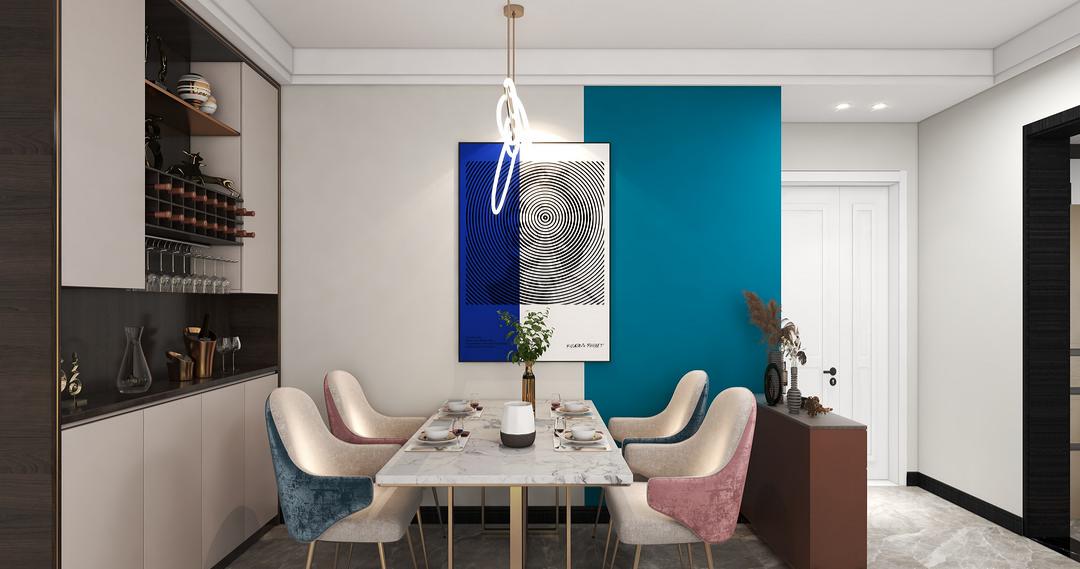 餐厅区域亮点十足!定制酒柜不仅颜值在线,收纳力更是满分,轻松搞定酒水和餐具收纳。蓝色挂画与粉色座椅精准呼应玄关配色,冷暖碰撞让用餐氛围都变得鲜活起来。