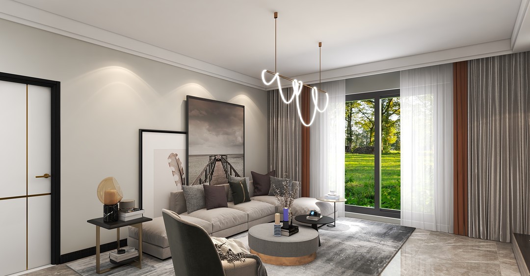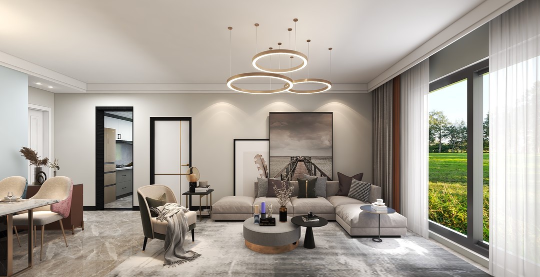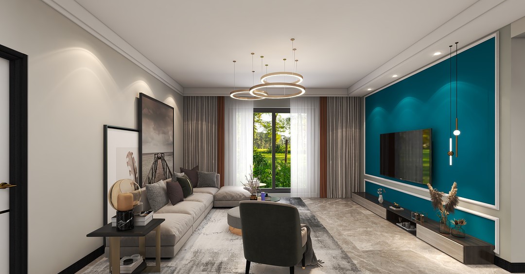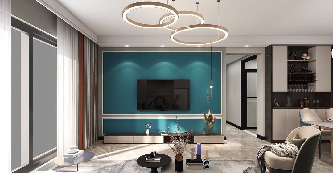 客厅更是颜值担当!深蓝色背景墙搭配精致石膏线,现代线条感直接拉满,顶面筒灯层层递进,让背景墙的立体感爆棚。L 型灰色极简沙发时尚又舒适,搭配干净利落的沙发背景墙,给空间留足了灵活感。弧形吊灯增添了几分俏皮趣味,墙面挂画与筒灯相互呼应,每一处细节都透着设计感。