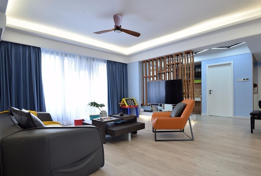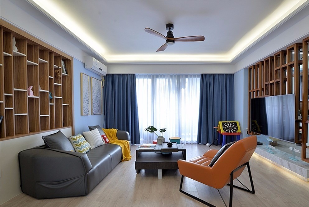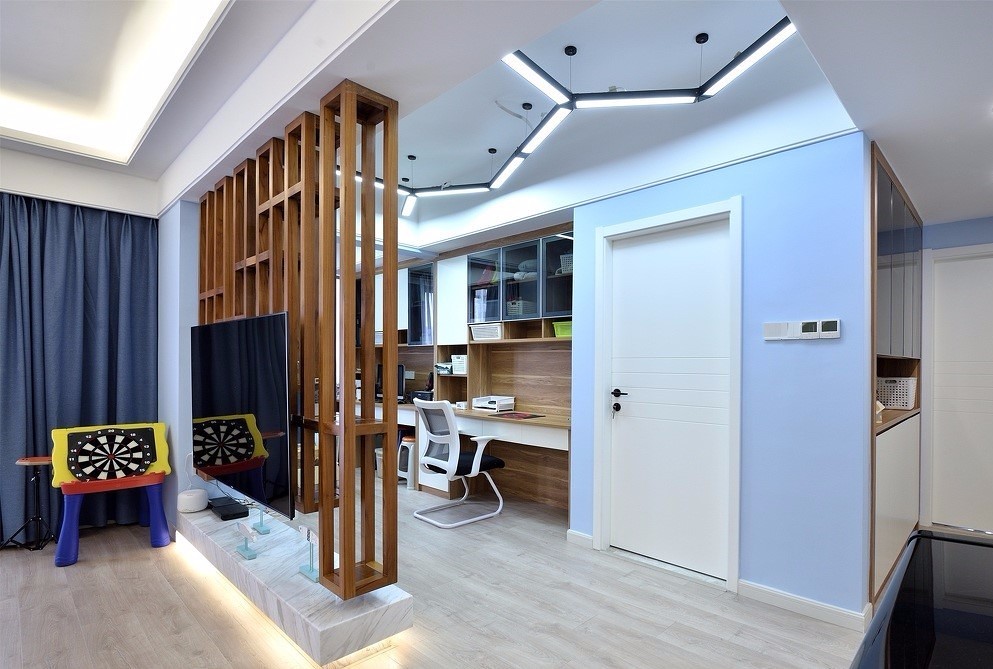 客厅设计兼具格调与质感,电视背景墙采用木栅栏造型,营造自然温润的氛围;沙发背景墙以艺术品格子装饰,为空间注入文艺气息,两者相互呼应,打造出层次丰富的视觉焦点。