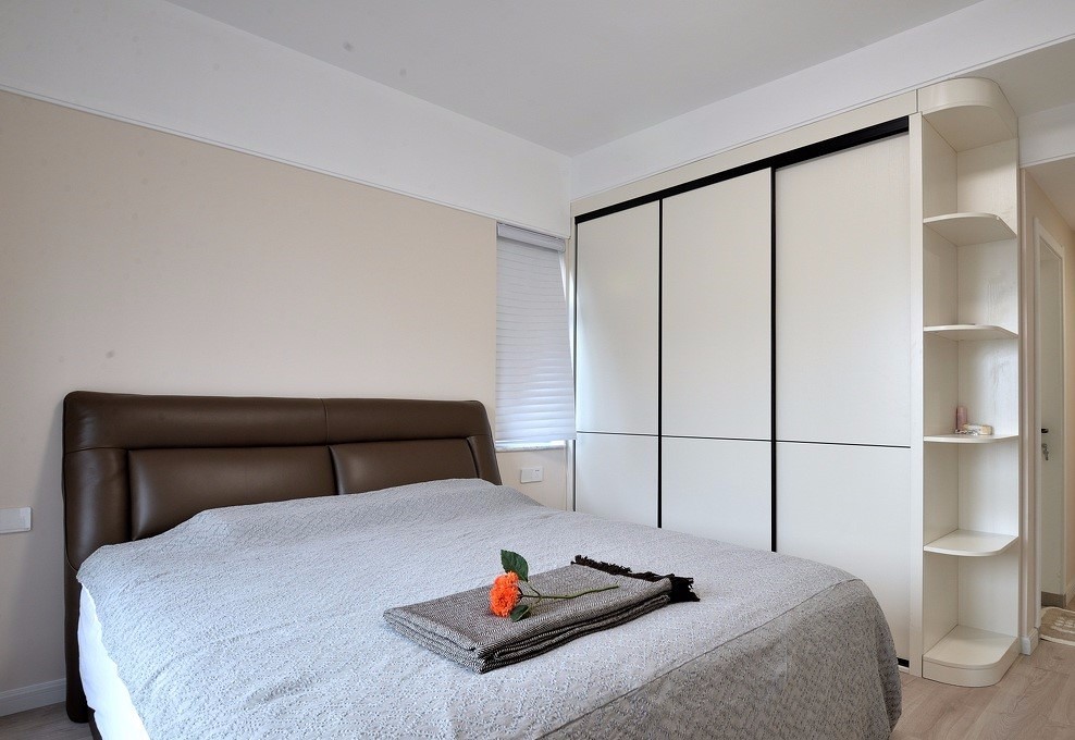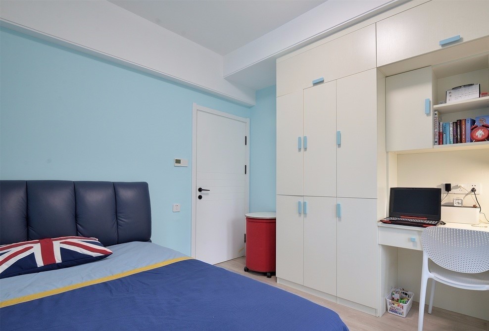 卧室延续实用主义设计,定制柜体与墙面精准贴合,实现无缝衔接,避免积灰难题,最大化利用每一寸空间。次卧铺设温馨木地板,搭配定制书桌与衣柜一体化设计,学习、收纳功能一步到位,满足多元需求。