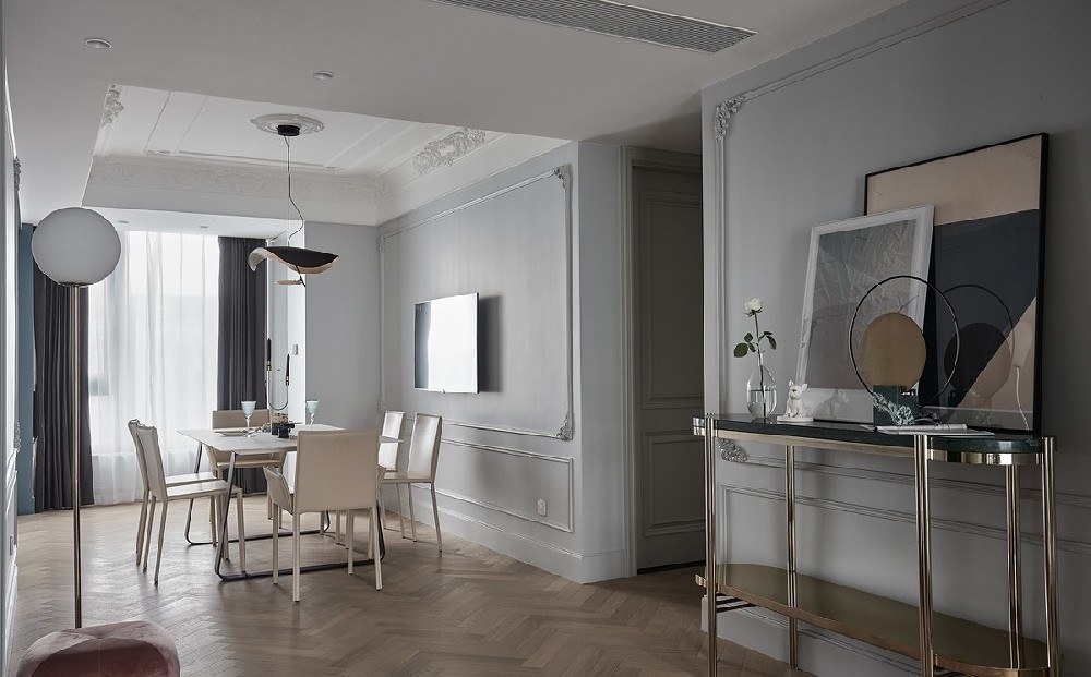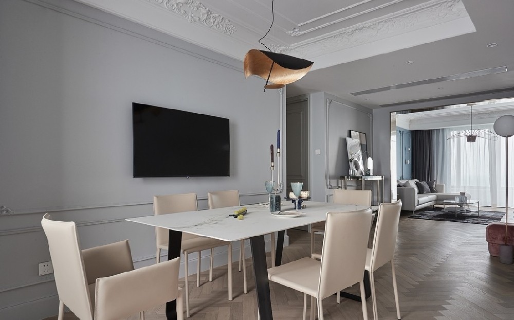 餐厅墙面巧用石膏线做立体造型,勾勒简约大气的视觉层次,搭配嵌入式电视,兼顾用餐氛围与休闲娱乐需求,打破传统餐厅单一功能。