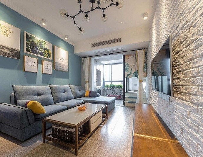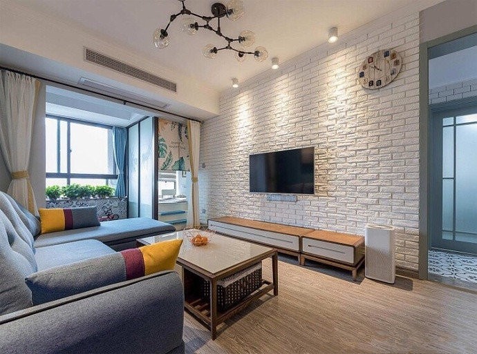 文化墙背景:电视背景墙没有做复杂的造型,而是选用了网红文化砖,复古质感拉满,几百块就能出效果。
