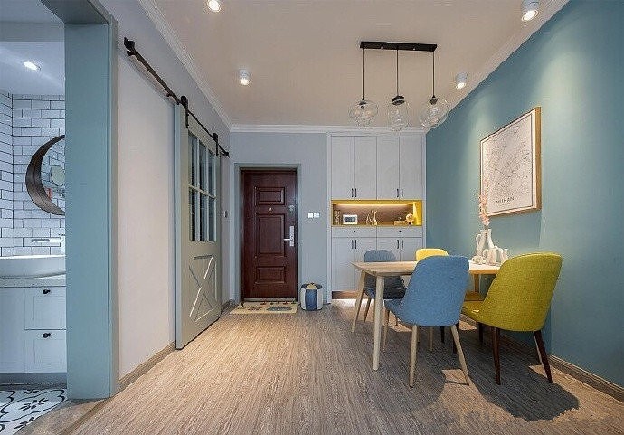 吊式推拉门:厨房门选用吊轨推拉门,无卫生死角,比传统地轨更显高级,还不绊脚。