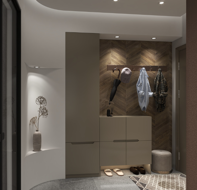 门厅设计重新规划门厅鞋柜空间,充分利用墙角,扩大收纳容量。设计自然流线的视觉导向,使门厅更加宽敞明亮。