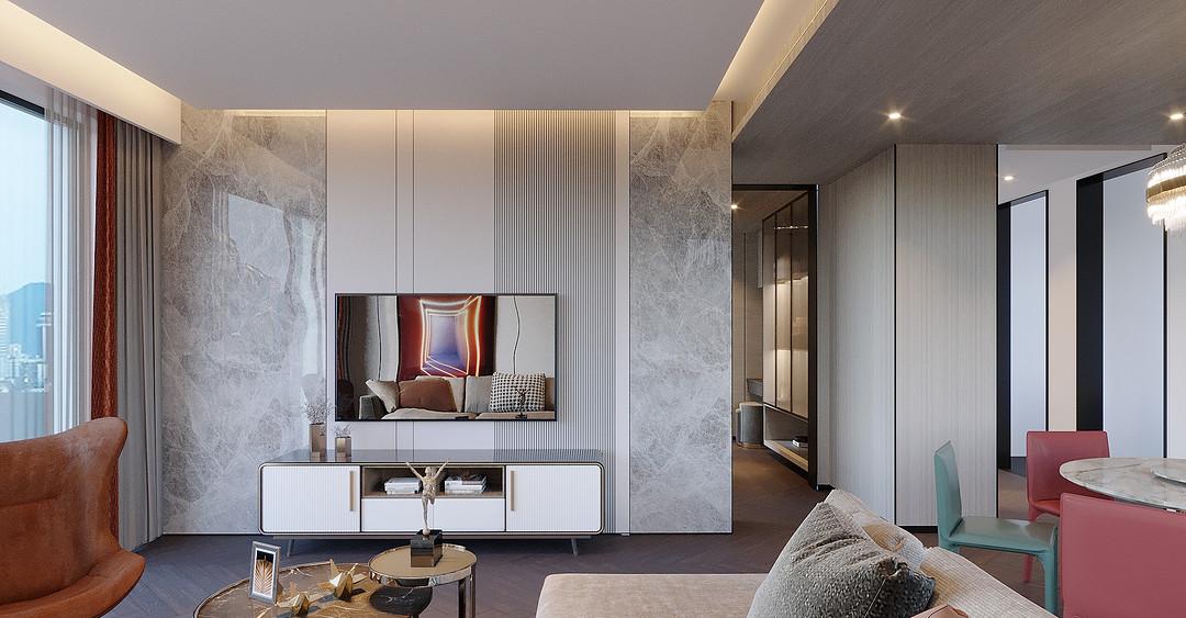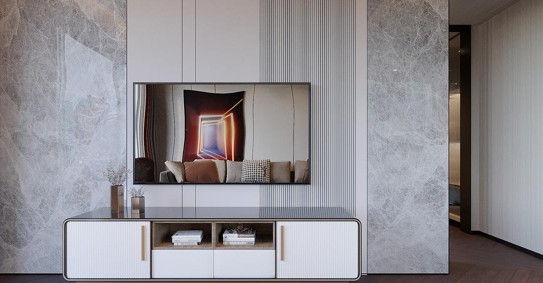电视墙设计聚焦层次感营造,选用抛光石材作为主体,细腻的磨纹石材与周边墙板进行精准拼合,石材的冷峻质感与墙板的温润触感相互平衡,光线照射下更显纹理层次,成为客厅空间的视觉焦点,兼具现代简约与精致格调。