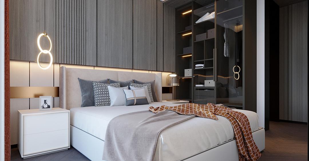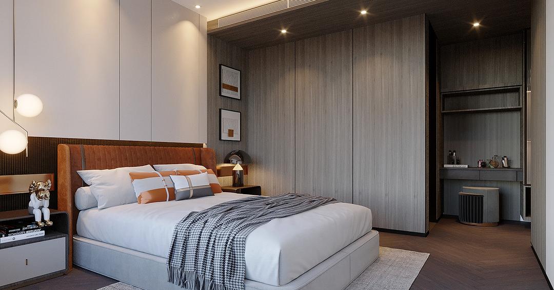 次卧室背景墙设计独具匠心,利用墙体突出部分进行造型设计,外部以木饰面包覆,内部内嵌灯带。当灯光亮起时,柔和光线勾勒出墙面的立体轮廓,使背景墙层次更为丰富,既避免了空间单调,又营造出温馨舒适的休憩氛围。