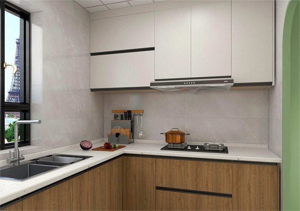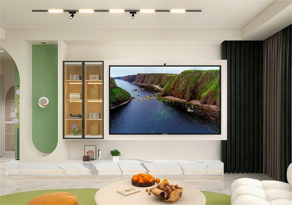 造型的电视背景墙搭配装饰灯,在进入空间给人一种时尚感; 开放式厨房设计让空间的光线更加的良好,弧形设计的门洞让空间更圆润; 双眼皮设计的卧室让空间不仅充满时尚感,也不压低空间的层高,色彩的搭配增加了空间的清新感。